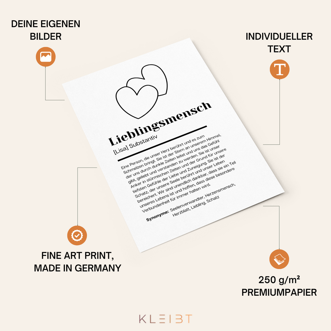 Mit wenigen Klicks kannst du am PC oder Handy dein individuelles Poster gestalten, indem du Namen und Bilder spielend leicht hinzufügst. Unsere intuitive Benutzeroberfläche macht den Personalisierungsprozess schnell und unkompliziert, sodass du im Handumdrehen ein individuelles Geschenk kreierst. So entsteht mit minimalem Aufwand ein maximal persönliches Poster, das sicher beeindruckt.