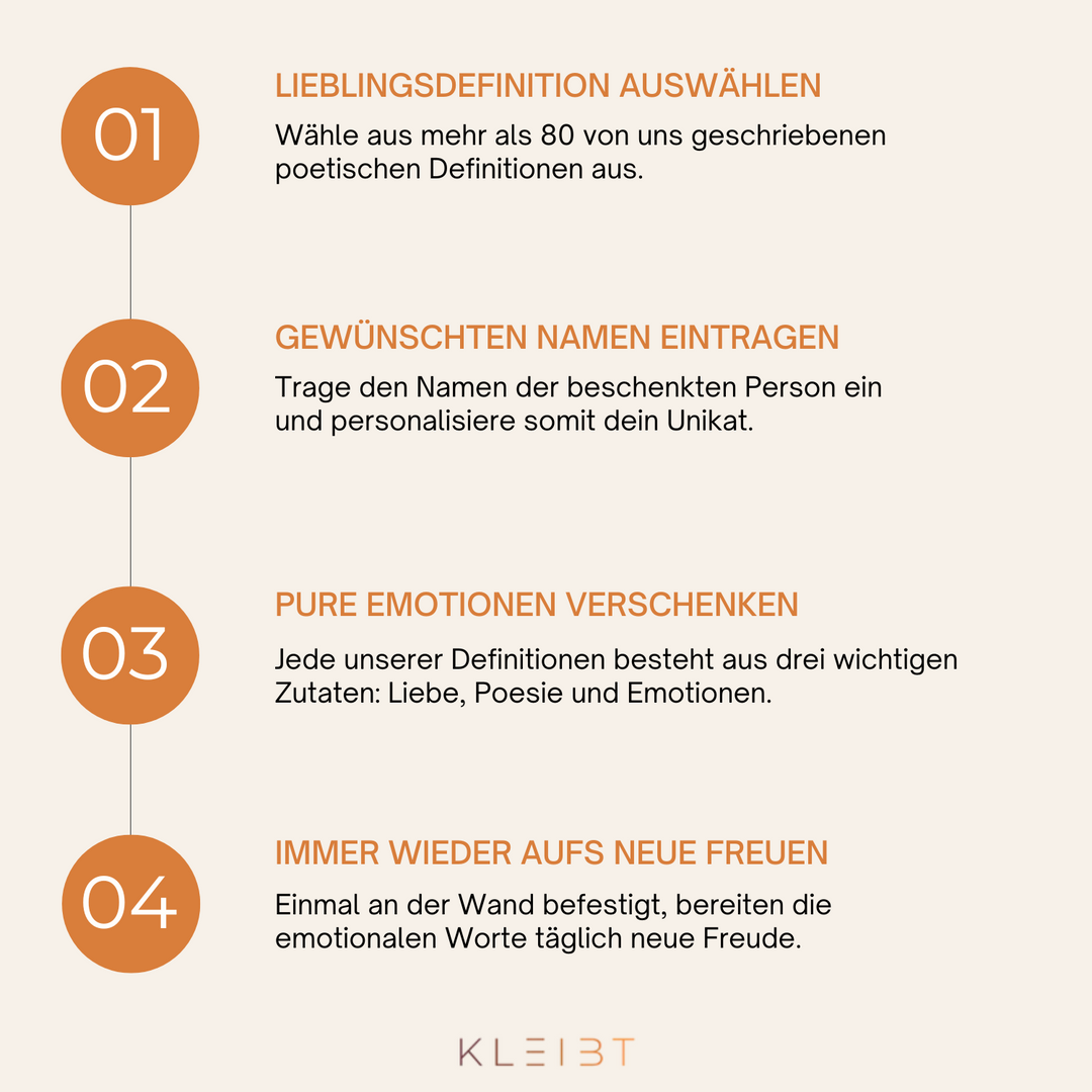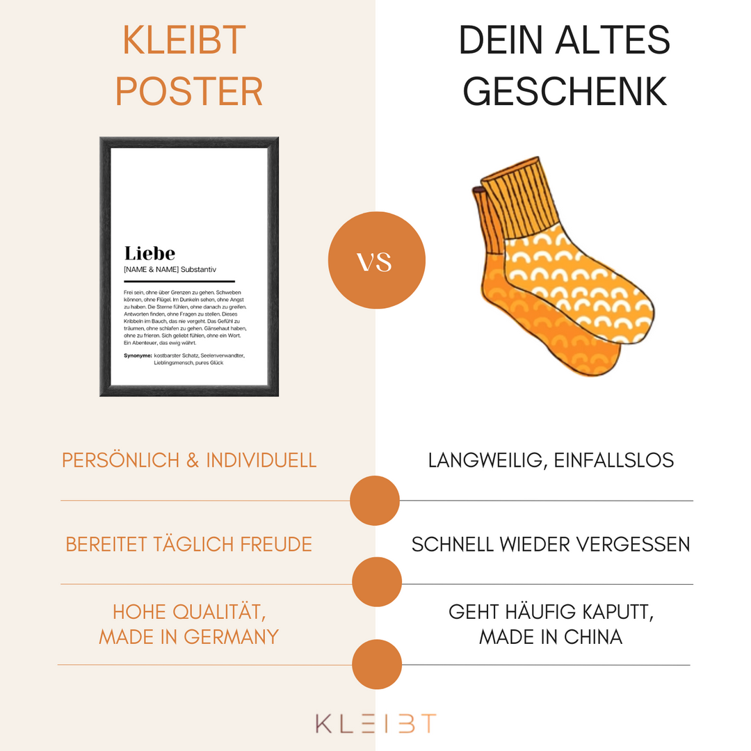 "Ich hatte in den letzten Jahren immer große Probleme, das passende Geschenk für meine Eltern und meine Schwester zu finden. Meistens war es am Ende irgendein Gutschein oder ein neues Paar Socken, total kli­schee­haft. Und ich war jedes Mal von mir enttäuscht, da sie eigentlich so viel mehr verdient haben. Ich finde aber nie die passenden Worte. Dann habe ich KLEIBT.de gefunden und sofort zwei gerahmte Poster bestellt. Das war das schönste Weihnachten, an welches ich mich erinnern kann. Meine Mutter hat angefangen zu weinen und meine Schwester meinte, das war das schönste Geschenk, was ich ihr je gemacht habe. Danke für die tollen Poster."