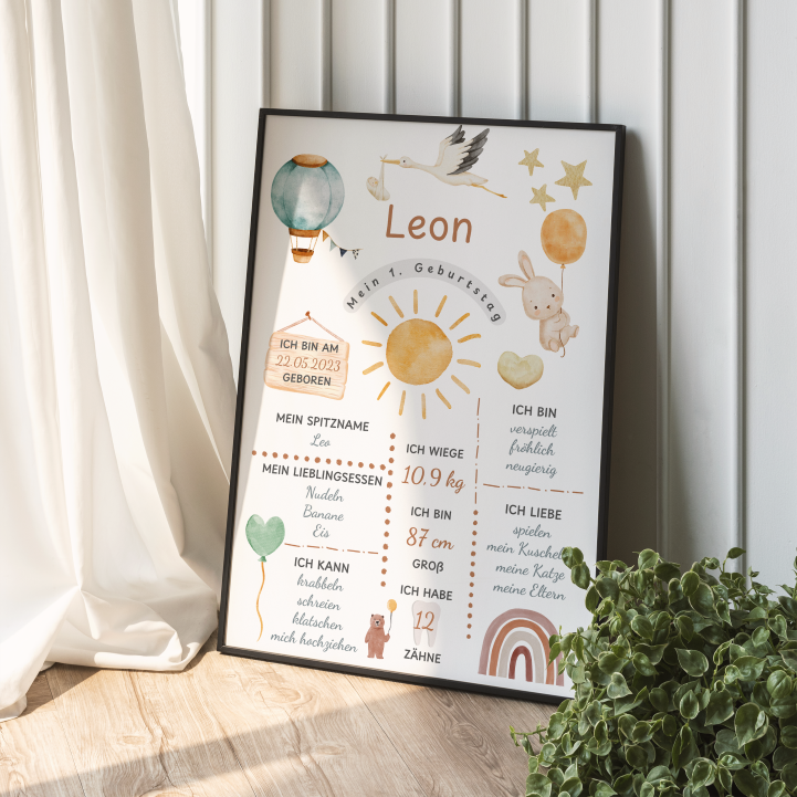 Diese personalisierbare Meilensteintafel fĂŒr den ersten Geburtstag ist die ideale Möglichkeit, die wichtigsten Momente des ersten Lebensjahres deines Kindes festzuhalten. Du kannst Details wie GröĂe, Gewicht, das Lieblingsessen sowie die Anzahl der ZĂ€hne eintragen, um ein einzigartiges Andenken zu gestalten. Das Poster ist im Handumdrehen personalisiert und eignet sich perfekt als Geschenk zum ersten Geburtstag. Mit seinem kindlichen Design ist es nicht nur eine liebevolle Dekoration fĂŒr das Kinderzimmer, sondern auch ein wunderschönes Andenken. Es bewahrt die besonderen Meilensteine und macht die ersten Erfolge deines Kindes unvergesslich. Ein perfektes Geschenk fĂŒr Eltern und Familie.